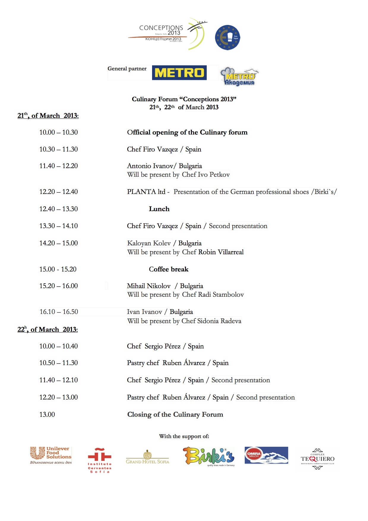 След успеха на първите две издания, Евро-Ток България ще организира Кулинарен форум “Концепции 2013”, посветен на Испанската кухня.Участниците са: