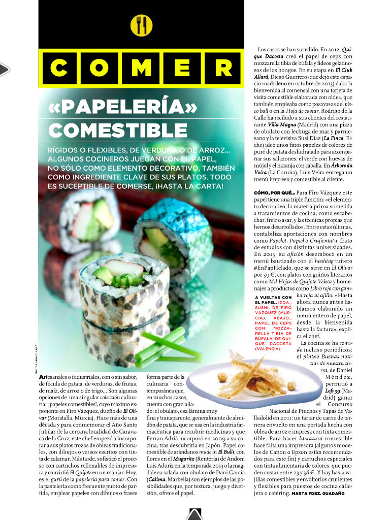 Hoy se publica un reportaje de Marta Fernández Guadaño en la revista «Metrópoli» del diario El Mundo, donde se muestra un recorrido por la historia del trabajo de Firo Vázquez con los Papeles Comestibles.