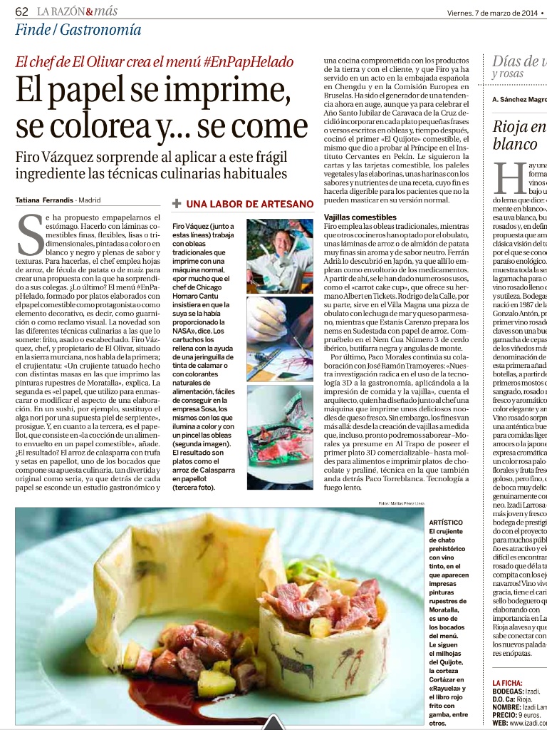 Hoy Viernes 7 de Marzo se publica el el diario La Razón un reportaje de Tatiana Ferrandis sobre el trabajo de Firo Vázquez con los Papeles Comestibles que os recomendamos leer.