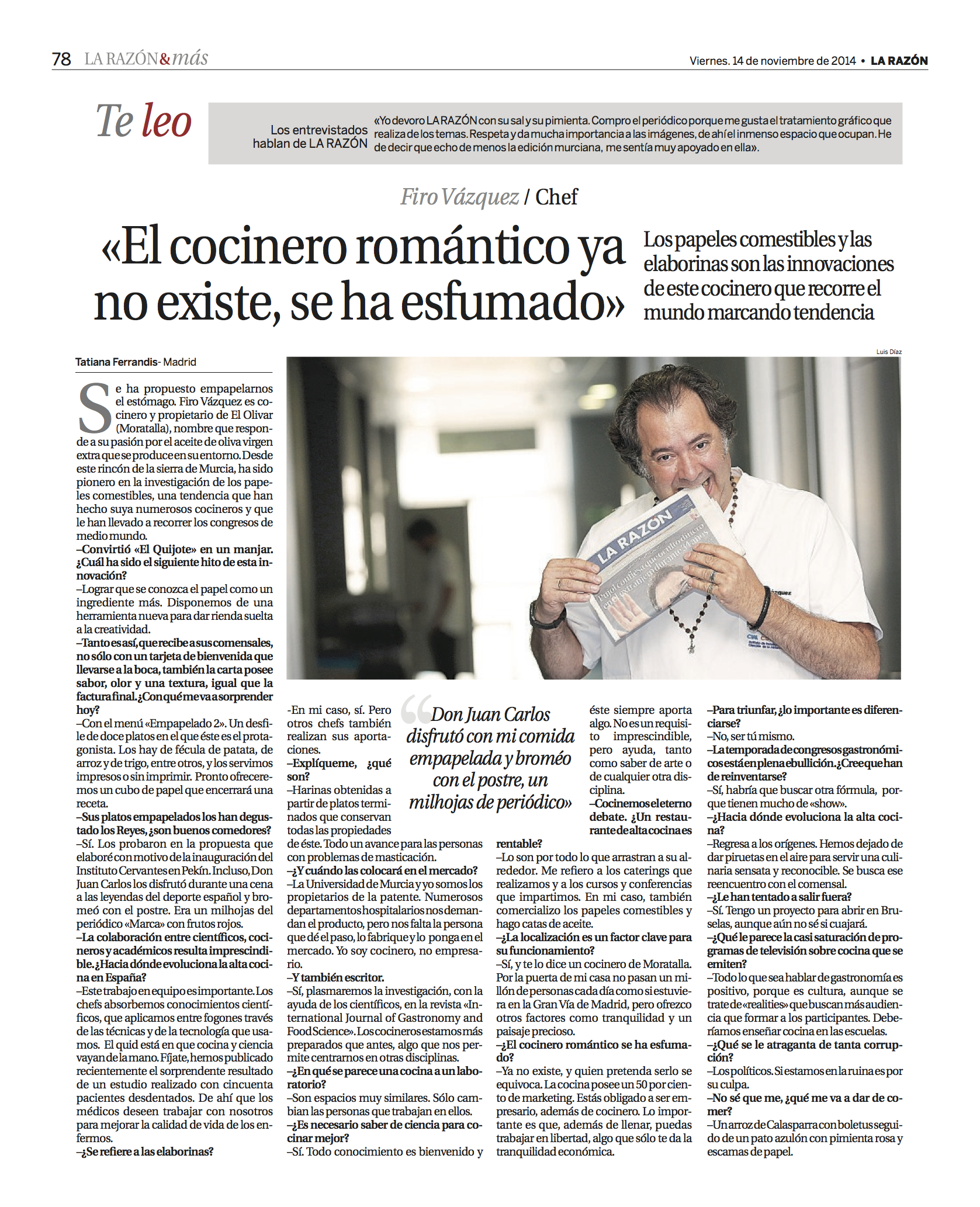 Se ha propuesto empapelarnos el estómago. Firo Vázquez es cocinero y propietario de El Olivar (Moratalla), nombre que respon- de a su pasión por el aceite de oliva virgen extra que se produce en su entorno. Desde este rincón de la sierra de Murcia, ha sido pionero en la investigación de los papeles comestibles, una tendencia que han hecho suya numerosos cocineros y que le han llevado a recorrer los congresos de medio mundo.