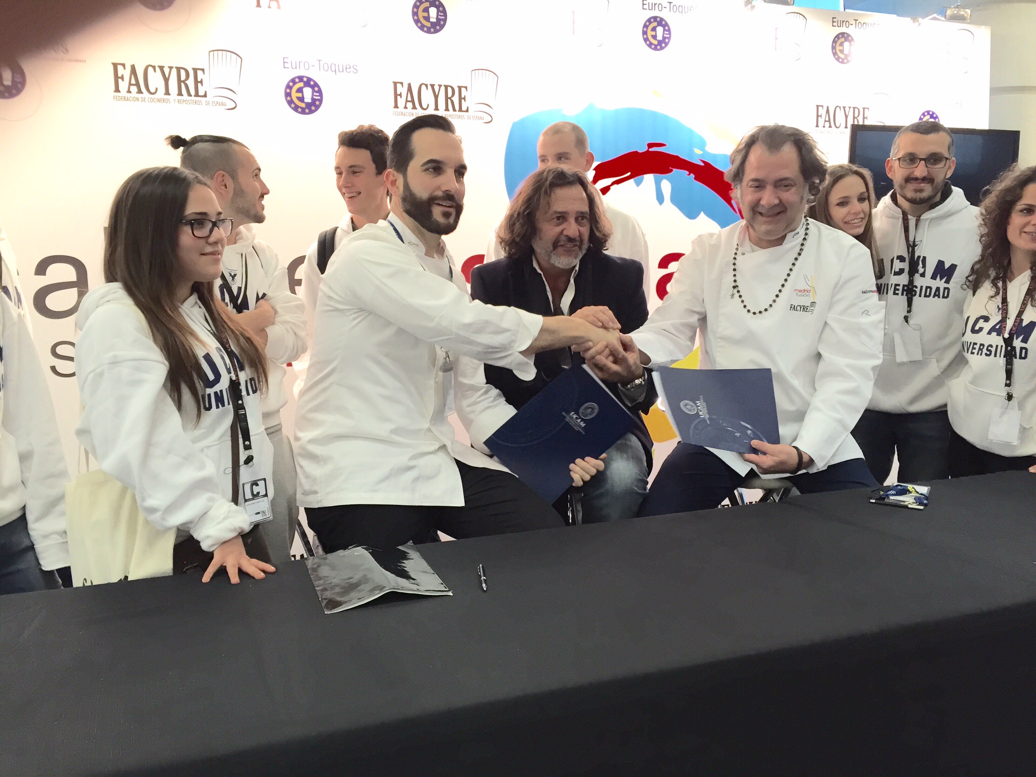 Mario Sandoval como Presidente de Facyre, Antonio Marquerie, Catedrático del citado grado y Firo Vázquez, rodeado de alumnos del UCAM han plasmado el acuerdo en el Stand de Saborea España de esta nueva edición de Madrid Fusión.